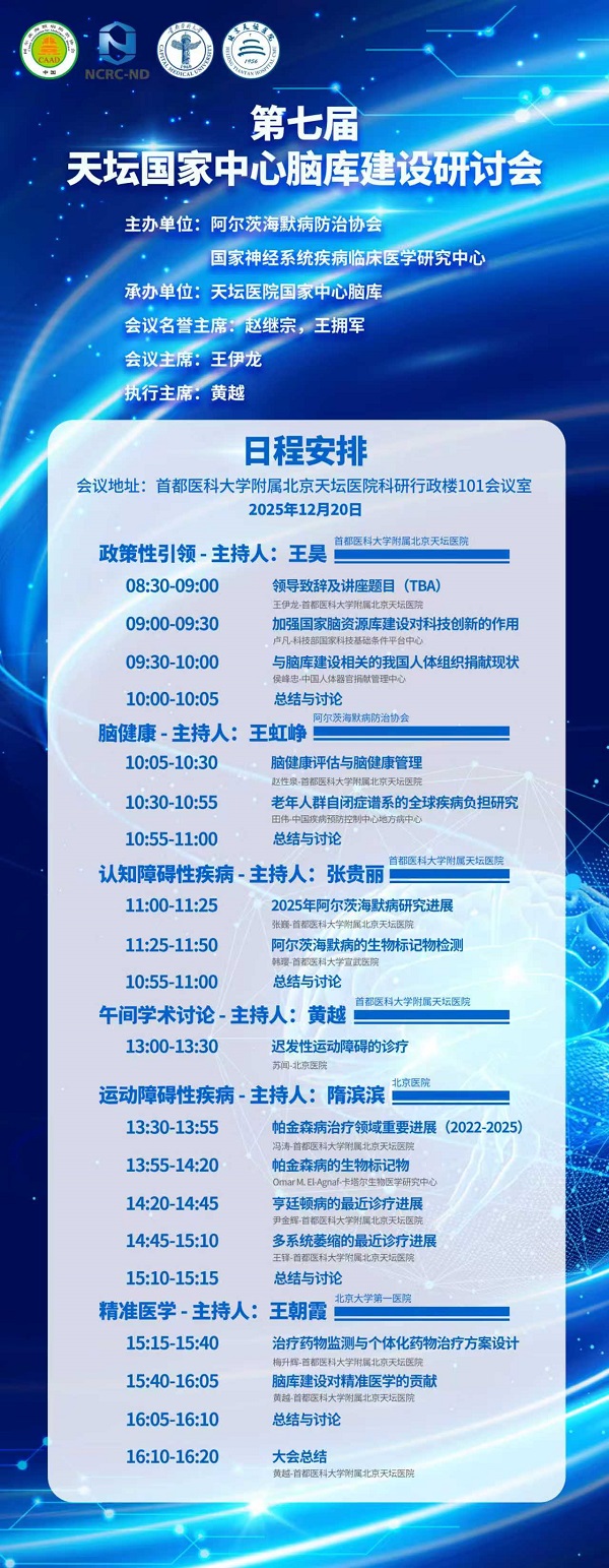 由阿尔茨海默病防治协会、国家神经系统疾病临床医学研究中心共同主办,天坛医院国家中心脑库承办的“第七届天坛国家中心脑库建设研讨会”将于12月20日在首都医科大学附属北京天坛医院启幕。本次研讨会采取“线上+线下”相结合的方式,敬请大家关注!
